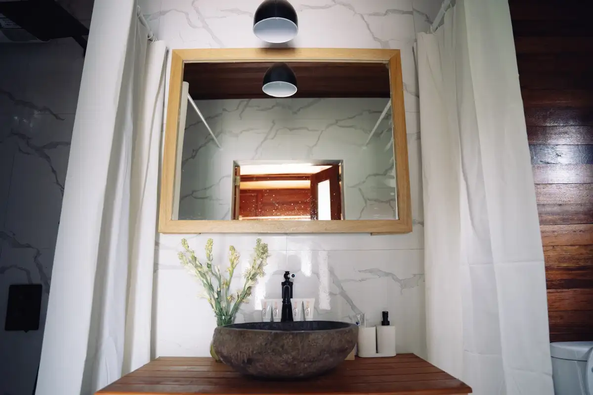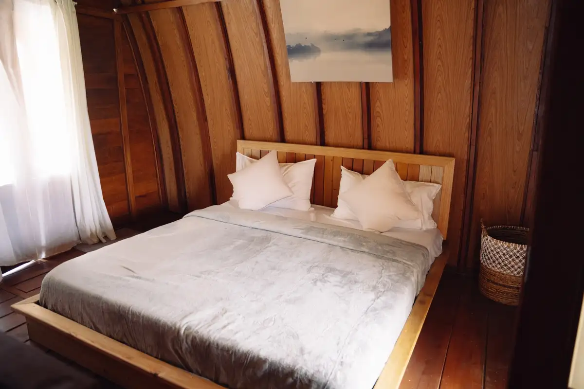 Penginapan luas dengan nuansa kayu yang hangat, menciptakan suasana tenang ...