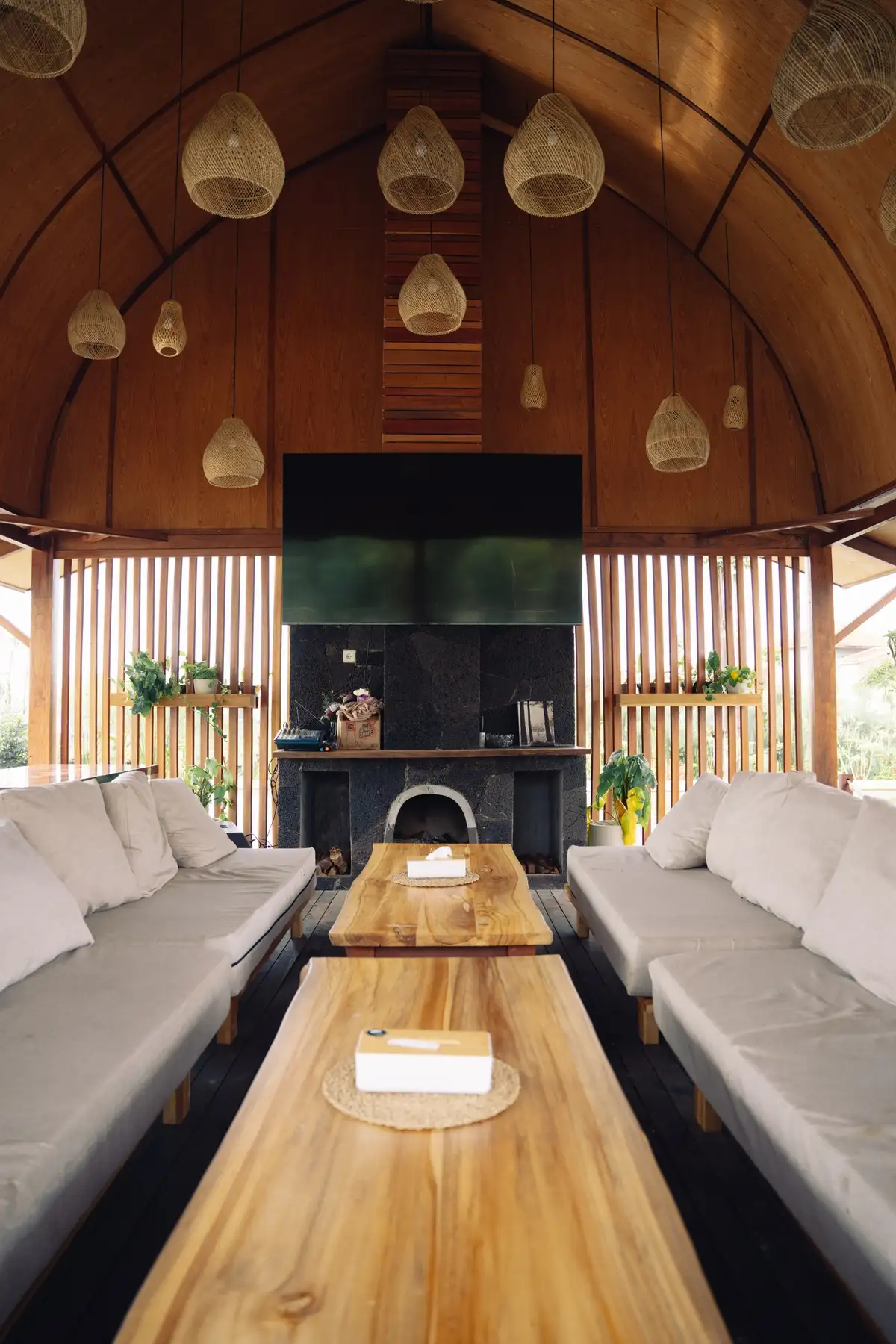 Saung Gaharu menghadirkan nuansa kayu hangat dengan desain lengkung khas da...